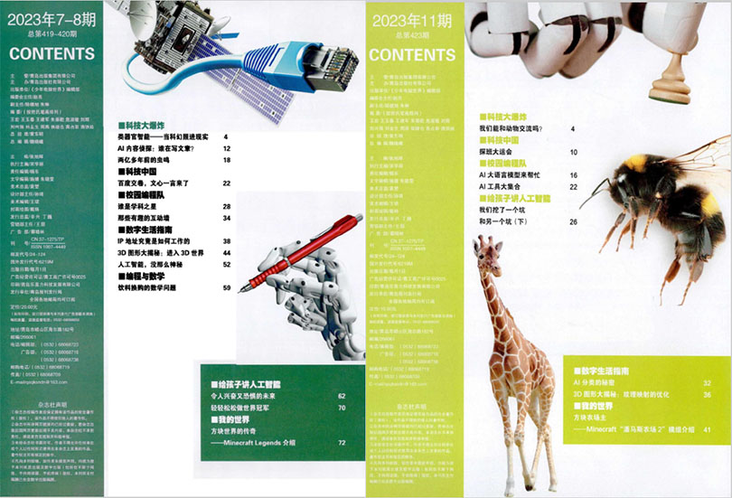 《少年电脑世界》杂志的内容丰富多样,包括计算机基础知识、编程入门、电脑游戏评测、科技发明和创新、网络安全等。每期杂志都会介绍一些有趣的技术和科技项目,如机器人、虚拟现实、人工智能等,同时提供相关的DIY教程和实践指导,让孩子们通过动手实践体验科技的乐趣。